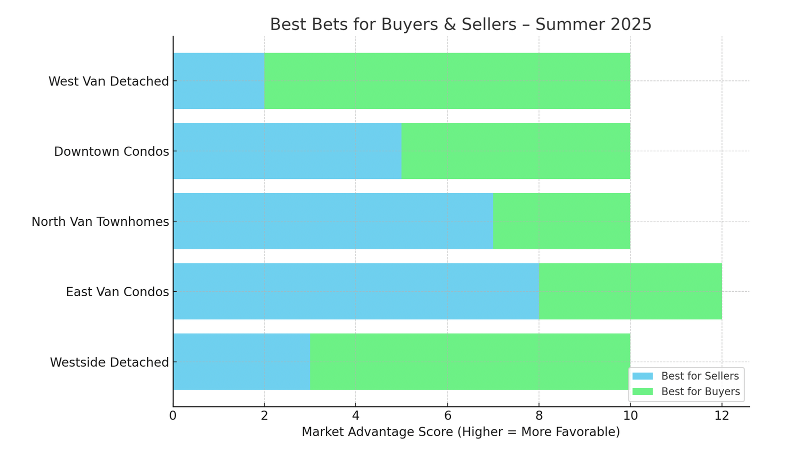 This visual guide outlines when and where each group might find the most traction in today’s market. It’s not about rushing into a decision—it’s about recognizing when the environment supports your goals. This bar chart shows how different property types and locations are currently skewed in favour of buyers or sellers. Use it as a reference to understand where opportunities—or competition—may be stronger this summer.