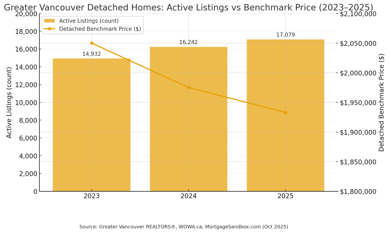 As of September 2025, Metro Vancouver had 17,079 active listings, up 14% from a year ago and well above the 10-year seasonal average. The sales-to-active-listings ratio sits around 46%, signalling a balanced market—neither buyer nor seller has the upper hand. Detached prices are down about 4% year-over-year, and condo prices have slipped roughly 3%.