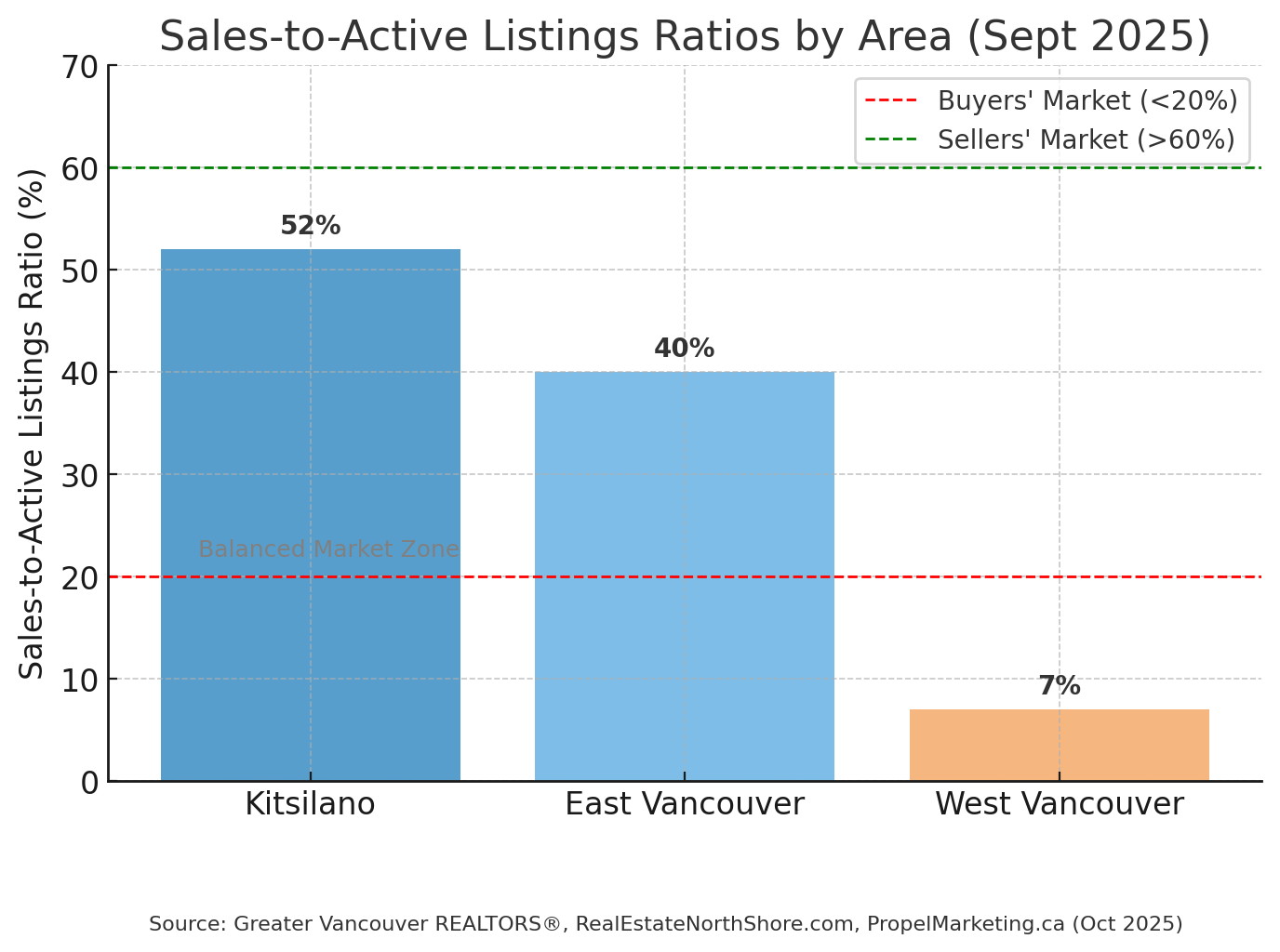 West Vancouver & North Shore: With a 6.7% sales-to-listings ratio and inventory up more than 20%, high-end properties are clearly in buyer-market territory. Sellers here must lead with realistic pricing and standout presentation.