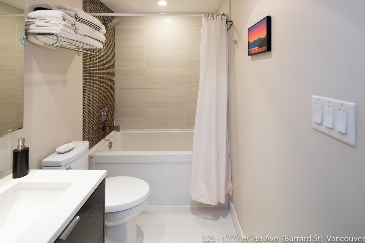Your condo at Kits 360 awaits. Nice layout with 466 sq ft. One bedroom plus flex space that can be used as a den, storage, walk in closet. One parking and One locker. Kitchen has Quartz counters, Miele Gas cooktop & electric oven. Fridge & dishwasher have cabinet doors to help hide them away, designer backsplash, and under cabinet lighting. There is a Kohler Soaker tub in the bathroom to help you relax. Dark Laminate flooring. Great location, walk to the shops and restaurants on W 4th - walk to Granville Island. Easy access to downtown. One (1) Dog or One (1) Cat OK. Tenanted needs 48 hours to show.